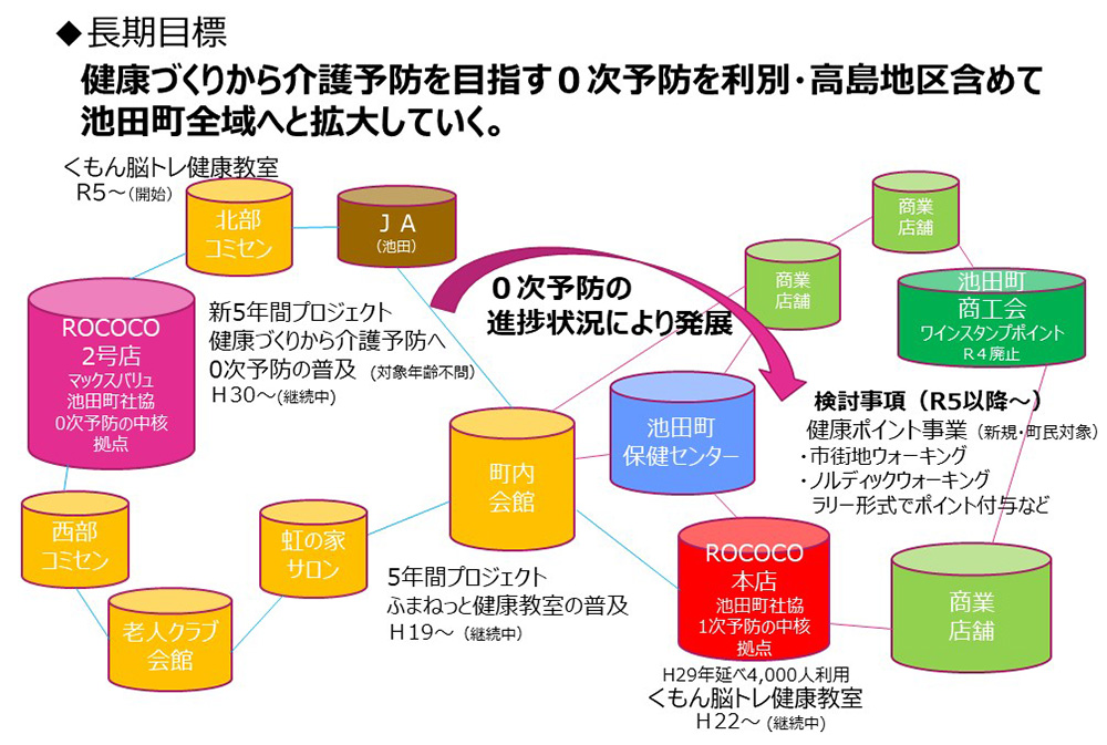 池田町社協では健康づくりから介護予防に年齢に関係なく取り組むきっかけをつくる0次予防事業に取り組んでいます。これは健康づくりをきっかけに介護予防に今まで関心の薄かった町民の方にも広く興味を持ってもらうことを目的とし、町民の生活に密着した場面、あるいは町民が多く集う場所などにおいて池田町地域で活動する法人及び団体等に協力を呼びかけ健康づくり及び介護予防活動の普及啓発を行います。
